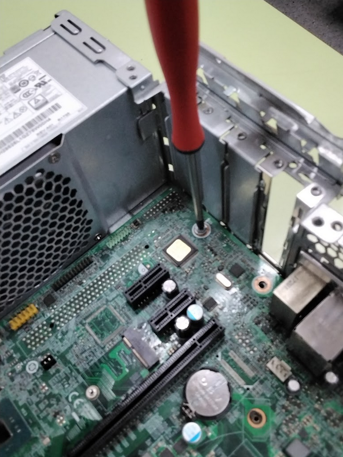 Ara el que farem ser acaragolar la placa base a la caixa, per fer això únicament hem d'ancorar-la amb els caragols, als forats que ja venen fets en la caixa, poden canviar les quantitats de caragols i la distribució, tot depèn de la mida de la teva placa.