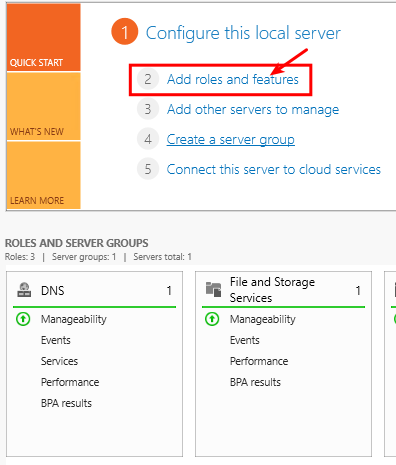 El primer que hem de fer serà anar a l’aplicació de server mànager, una vegada dintre clicarem a Add roles and features, que és on s’instal·laran els serveis com el AD, DNS, DHCP, etc