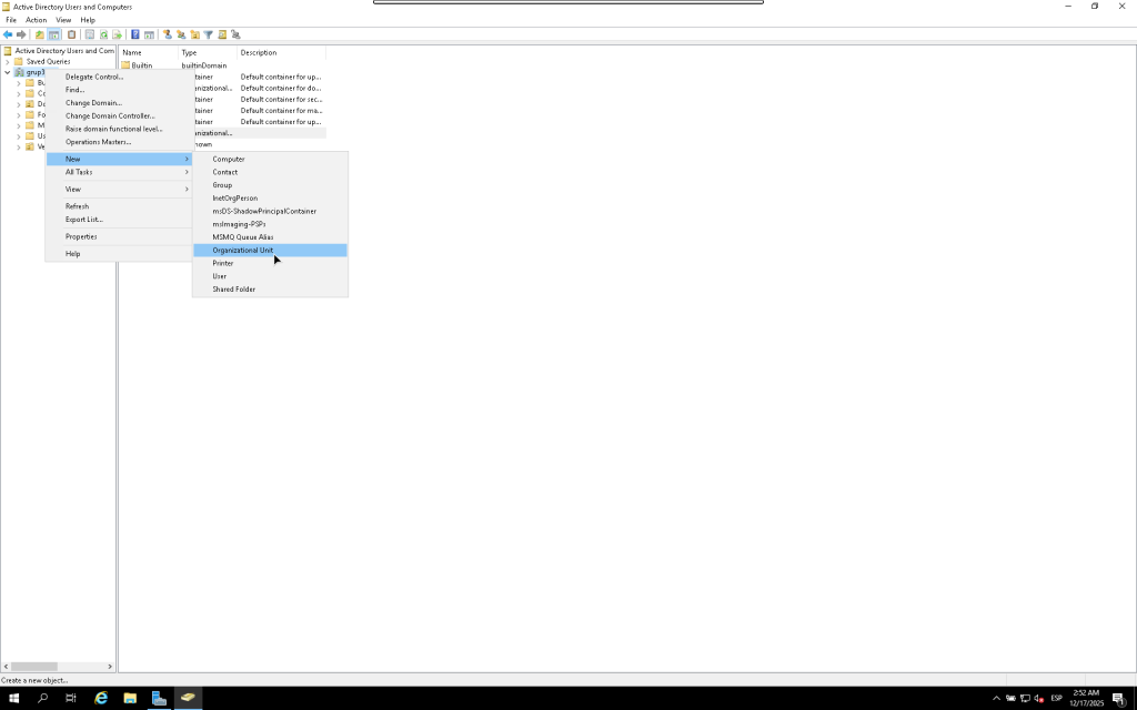 Ara el prime que farem sera crear la la primera OU, per crearla anirem al Domini, farem click dret, anirem a new i a Unitat organitzativa