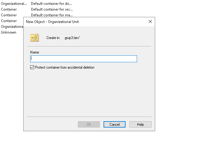 Una vegada cliquem dintre de crear assignarem el nom per aquest OU, i ja estaria creada la unitat organitzativa
